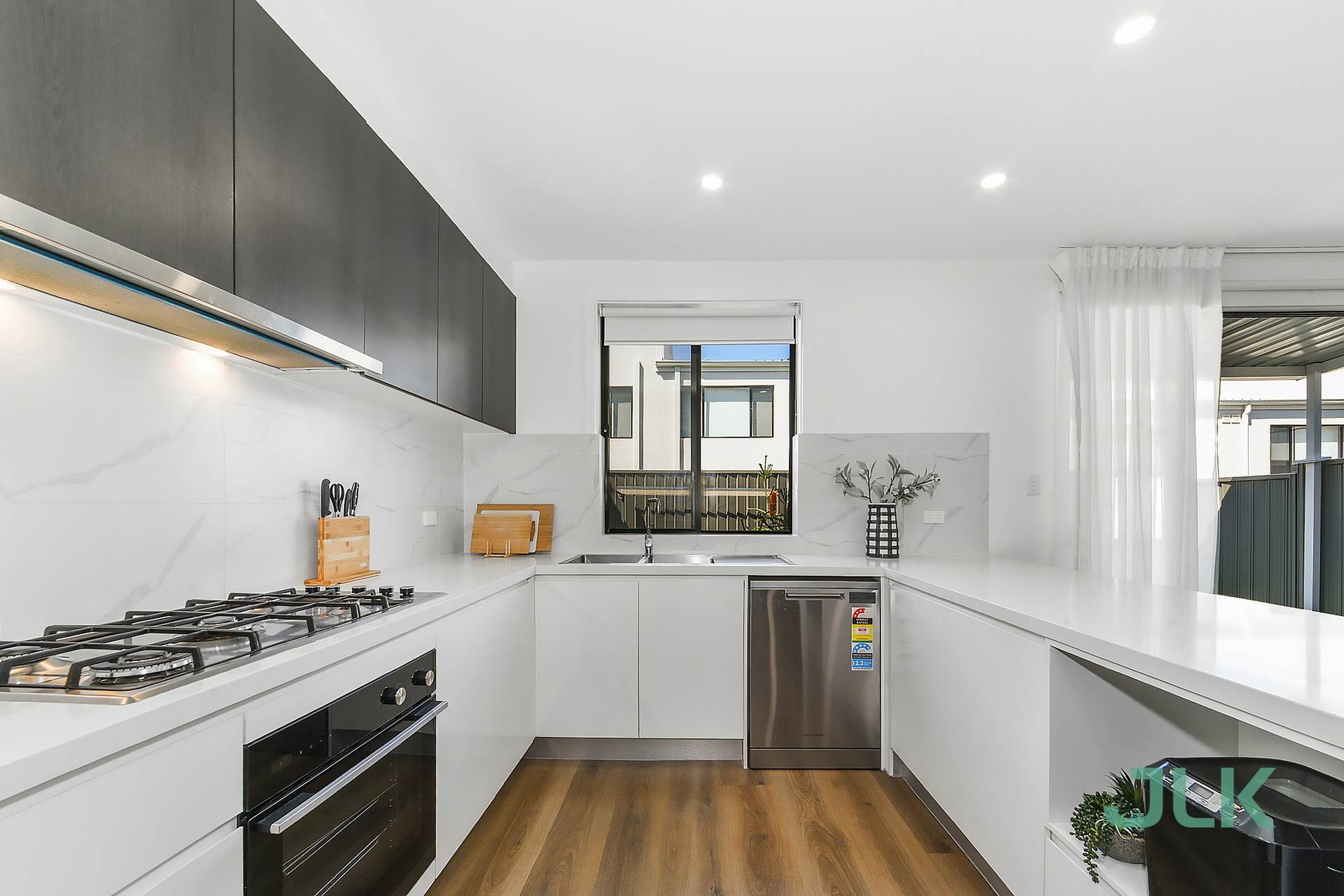 Sleek modern kitchen equipped with stone benchtops, gas cooking, and dishwasher